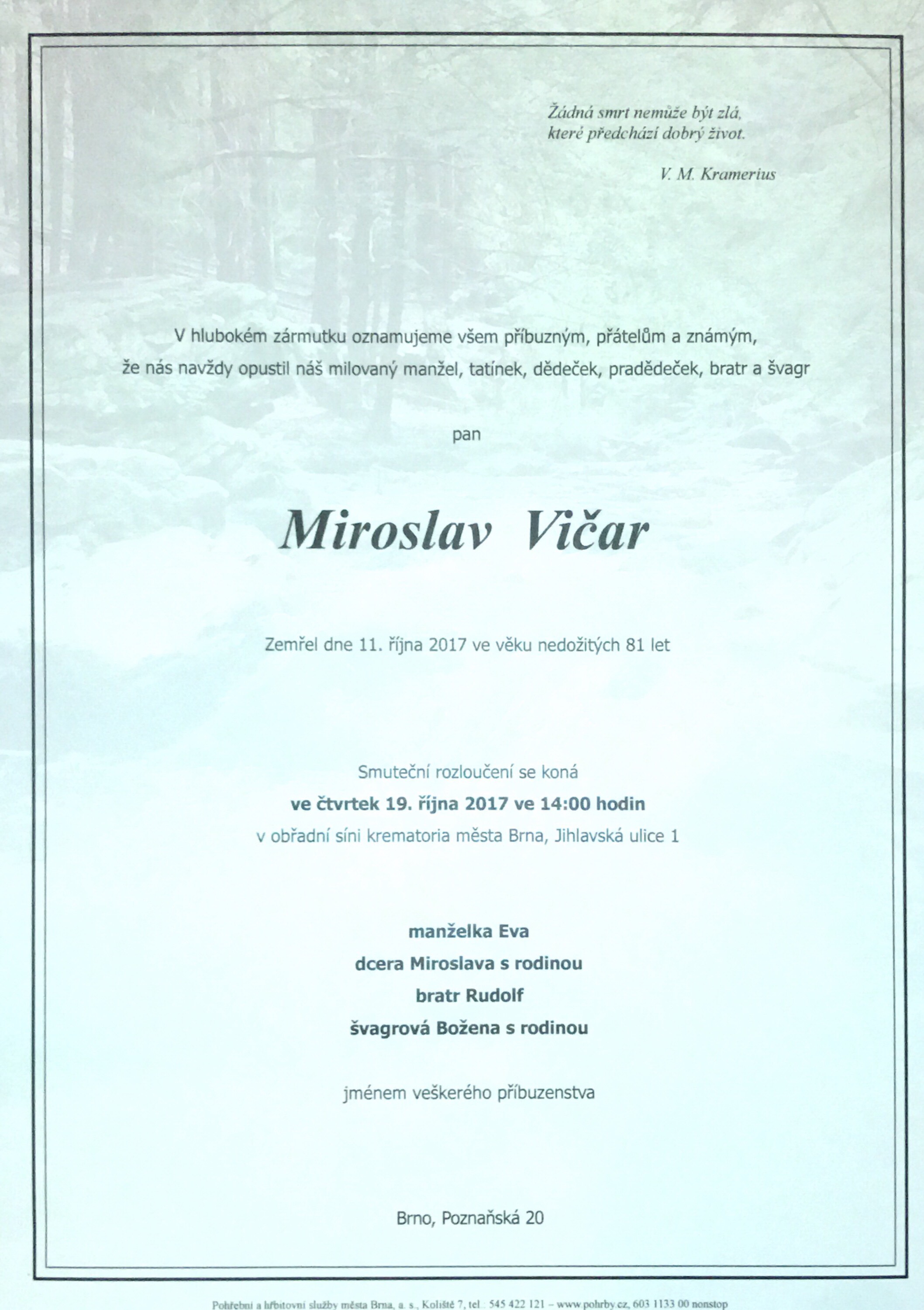 Poslední rozloučení bude ve čtvrtek 19.10.2017 ve 14 hodin v obřadní síni krematoria města Brna , Jihlavská ulice č.1
