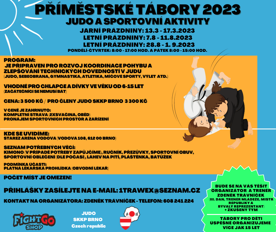 V týdnu od 7.8 do 11.8 se konal 1 turnus příměstského tábora se zaměření na judo a další aktivity. Tréninky probíhaly na tatami, chodili jsme každý den i na hřiště a byli jsme se koupat i v bazénu na Kraví hoře. Kdo by měl zájem si tábor zopakovat, bude mít možnost v termínu od 28.8 do 1.9.
